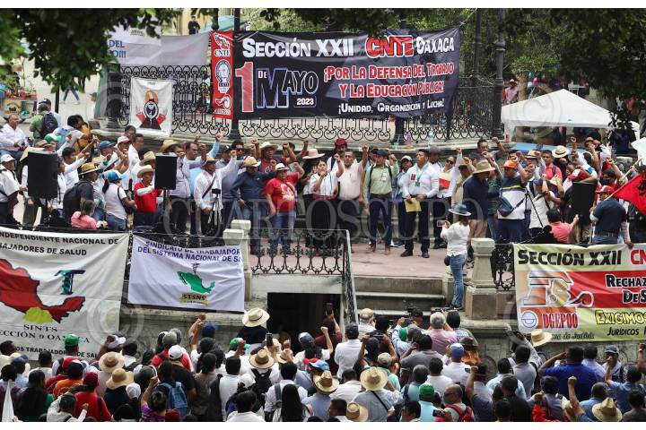 OAXACA, OAXACA, 01MAYO2023.- Más de 15 mil integrantes de la Sección 22 del Sindicato Nacional de Trabajadores de la Educación (SNTE) marcharon este día en conmemoración del Día del trabajo y para hacer entrega de su pliego de peticiones 2023. En el palacio de gobierno de Oaxaca, luego de su marcha la comisión política que encabeza la dirigente Yenny Pérez, entregó al gobernador del estado, Salomón Jara, su pliego de demandas que incluye peticiones laborales, administrativas y de justicia social. Los docentes dieron como plazo de respuesta el 5 de mayo próximo. FOTO: CAROLINA JIMÉNEZ/CUARTOSCURO.COM