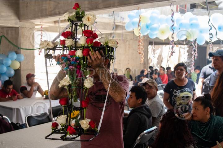 CIUDAD DE MÉXICO, 03MAYO2023.- Miles de trabajadores de la construcción celebraron en el país el Día de la Santa Cruz, en este festejo se celebra una misa en las obras para pedir que no haya accidentes fatales, además de agradecer por el trabajo. Tras el ritual religioso se agasaja a los maestros albañiles con barbacoa y un trago para que se relajen del trajín diario. FOTO: MOISÉS PABLO/CUARTOSCURO.COM