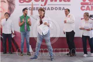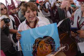 NOPALTEPEC, ESTADO DE MÉXICO, 05MAYO2023.- Delfina Gómez, candidata a la gubernatura del Estado de México, por la coalición Morena, PT y PVEM, durante su gira de campaña en la explanada de la entidad. FOTO: MARIO JASSO/CUARTOSCURO.COM