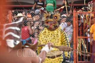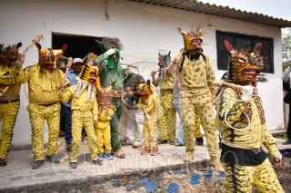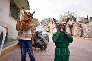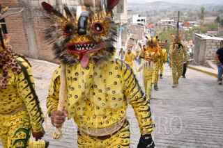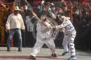 ZITLALA, GUERRERO, 05MAYO2023.- Conservando su tradición ancestral, habitantes de Zitlala realizaron su “Atsatsilistli” (Ritual del Jaguar), que son peleas de tecuanes (tigre o jaguar), para pedir que la temporada de lluvias sea provechosa para sus cosechas. Antes de llegar al centro de la ciudad, donde los espera una improvisada arena hecha con malla ciclónica, los Tigres recorren las calles de la cabecera municipal, que en su mayoría siguen siendo indígenas Nahuas, para avisar que el ritual va a comenzar. Al llegar, lo hacen dividirse en dos bandos y por parejas empiezan a meterse a pelear, adornados con una máscara de cuero y con una reata tensada, hasta lo último de su resistencia y curada con mezcal, simulan la cola del tecuan que es usada como un látigo contra su rival. El duelo termina cuando uno de los dos tecuanes diga que ya no puede más, algunos levantan las manos en señal de victoria, se acercan a su rival y se dan la mano o un abrazo, así mismo se agradecen por la lucha. Los pobladores indican que el pegarle al cuerpo o a las máscaras de cuero con la cuerda curada simulan los rayos y truenos con las que se anuncian las lluvias. Esta petición, es la última de esta zona indígena de Guerrero, por lo que esperan que en próximas fechas comiencen las lluvias y puedan tener una cosecha provechosa. Cientos de hombres participan año con año en este ritual, que dura de 4 a 6 horas de peleas, en las calles puedes ver niños desde los 3 años portando con orgullo y respeto a la vestimenta de tecuan. FOTO: DASSAEV TÉLLEZ ADAME/CUARTOSCURO.COM