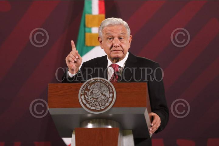 CIUDAD DE MÉXICO, 08MAYO2023.- Andrés Manuel López Obrador, Presidente de México, encabezó su mañanera en la cual hablo sobre los avances del Tren Maya y mango el pésame por el deceso de Conchita Nava. FOTO: MOISÉS PABLO/CUARTOSCURO.CON