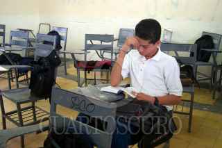 Juan Carlos Galván estudiante del Colegio de Bachilleres lee un libro mientras sus compañeros se divierten a fuera del salón. Este día regresaron los millones de estudiantes de los diversos niveles a sus centros de estudio después de las fiestas de fin de año . FOTO: German Romero/CUARTOSCURO.COM