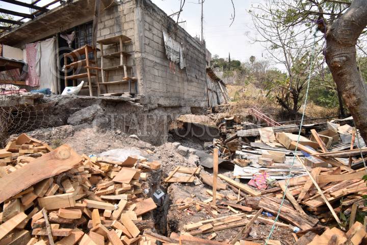CHILPANCINGO, GUERRERO, 08MAYO2023.- Al menos 33 viviendas, solo 10 han sido desalojadas, se encuentran en peligro, esto por el colapso y desplazamiento del subsuelo de la barranca que se encuentra en los limites de las colonias 1ro de Mayo, Ocozuapa, Noche Buena y Sección VII. De acuerdo con testimonios de los vecinos la tarde del jueves comenzaron a escuchar ruidos extraños, posteriormente ligeros movimientos y derrumbes de tierra en las inmediaciones de la barranca La Lobera. Pero fue hasta la madrugada del 5 de mayo que los vecinos de la colonia ampliación 1⁰ de mayo, alertaron a las autoridades sobre la caída de tierra y la aparición de grietas, al lugar acudió personal de la Coordinación Protección Civil Chilpancingo y Bomberos, y se comenzó la evacuación de 10 casas. Siendo unas 100 personas que tuvieron que sacar sus pertenencias y alojarse de manera temporal en un albergue de la Universidad Autónoma de Guerrero (UAGro), sin embargo, hasta este lunes 8 de mayo, al medio día, la cifra aumento a 300 personas afectadas y 33 viviendas. FOTO: DASSAEV TÉLLEZ ADAME/CUARTOSCURO.COM