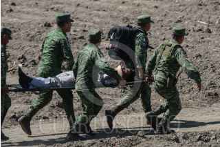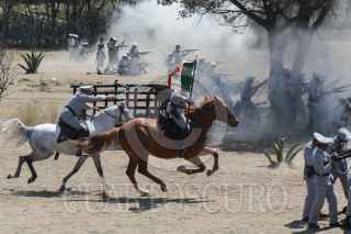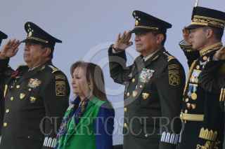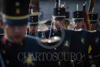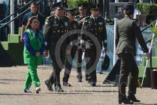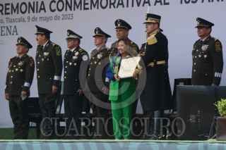 APIZACO, TLAXCALA, 09MAYO2023.- Luis Cresencio Sandoval, secretario de la Defensa Nacional; Lorena Cuéllar, gobernadora del Tlaxcala, y Jorge Antonio Maldonado Guevara, director del Heroico Colegio Militar, encabezaron la ceremonia conmemorativa por el "103 Aniversario de la Última Carga al Sable de Caballería”. FOTO: MARIO JASSO/CUARTOSCURO.COM