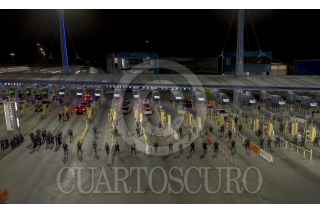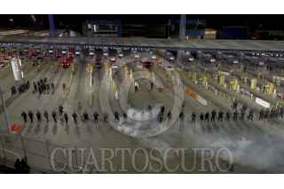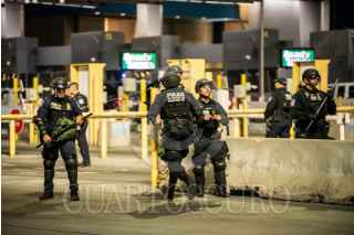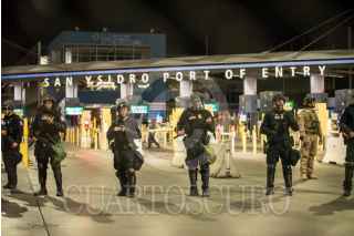 TIJUANA BAJA CALIFORNIA, 11MAYO2023.-La garita de San Ysidro fue cerrada durante 10 minutos, tras llevarse a cabo un simulacro por parte de la CBP. Alrededor de 30 a 40 elementos de la oficina de Aduanas y Protección Fronteriza de los Estados Unidos por sus siglas en inglés, participaron en el evento. Con el objetivo de estar preparados en caso de requerir un cierre de la garita, de manera inmediata, por una invasión o ataque. Con protecciones y lanzando bombas de gas, los elementos, hicieron una valla para simular la protección de la frontera. Aproximadamente a las 21:10 horas, las líneas de la garita, fue reabierta y retomó su tránsito de manera convencional. FOTO: OMAR MARTÍNEZ/ CUARTOSCURO.COM