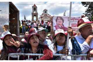 JOQUIPILCO, ESTADO DE MÉXICO, 12MAYO2023.- Delfina Gómez, candidata a la gubernatura del Estado de México, por la coalición “Juntos Hacemos Historia” conformada por los partidos políticos: Morena, PT y PVEM, durante su gira de campaña en la explanada de la entidad. FOTO: MARIO JASSO/CUARTOSCURO.COM