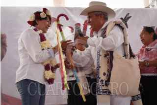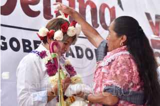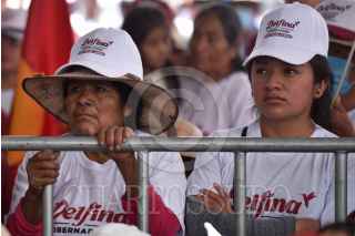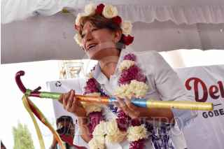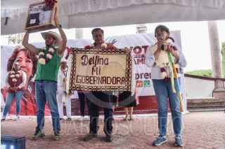 TEMOAYA, ESTADO DE MÉXICO, 12MAYO2023.- Delfina Gómez, candidata a la gubernatura del Estado de México, por la coalición “Juntos Hacemos Historia” conformada por los partidos políticos: Morena, PT y PVEM, durante su gira de campaña en la explanada de la entidad. FOTO: MARIO JASSO/CUARTOSCURO.COM