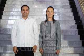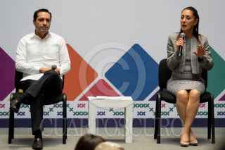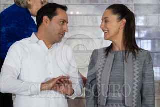 CIUDAD DE MÉXICO, 12MAYO2023.- Mauricio Vila, gobernador de Yucatán, y Claudia Sheinbaum, jefa de gobierno de la Ciudad de México, encabezaron la conferencia de prensa previo a la inauguración de Yucatán Expone, muestras que reúne a más de 100 expositores del estado en el Zócalo capitalino para mostrar la riqueza cultural de la entidad. FOTO: GALO CAÑAS/CUARTOSCURO.COM