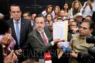 CIUDAD DE MEXICO, 16MARZO2023.- Cuitláhuac García, gobernador de Veracruz, acudió a la Fiscalía General de la República para presentar una denuncia formal en contra de los jueces Cuarto y Quinto, José Arquímedes Gregorio Loranca Luna y Mario de la Medina Soto, esto por encubrir actos ilegales en torno a la constitución de la Torre Centro en el Puerto de Veracruz. FOTO: ALBERTO ROA/CUARTOSCURO.COM