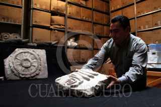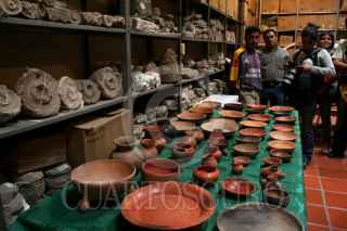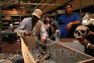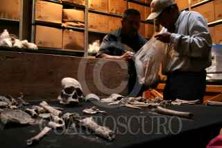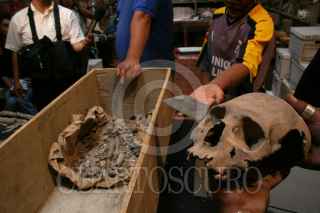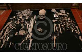 TULA, HIDALGO.- 16ABRIL2007.- El Instituto de Antropología e Historia mostró los restos humanos encontrados durante la excavación para la construcción del distribuidor vial. Se trata de la osamenta de un hombre adulto y de un niño encontrado en la PGR del estado sacrificado en un ritual de la cosecha del maíz. FOTO: PAOLA HIDALGO/CUARTOSCURO.COM