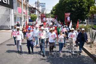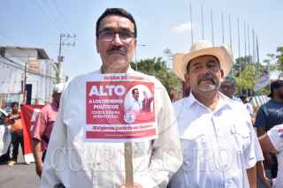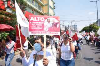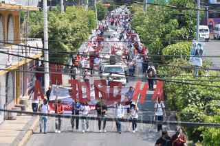 CHILPANCINGO, GUERRERO, 18MAYO2023.- Integrantes del Movimiento Antorchista de Guerrero, acompañados de activistas de otros estados marcharon este jueves para exigir avances en las investigaciones del homicidio de sus compañeros Conrado Hernández, Mercedes Martínez y su hijo Vladimir Tlacaélel Martínez, quienes fueron asesinados hace más de un mes. La marcha inició desde las 10:30 horas en el punto conocido como Banderas, para recorrer las principales avenidas con dirección hacia el Recinto Oficial del Poder Ejecutivo. La marcha estuvo encabezada por Homero Aguirre Enríquez, vocero nacional del Movimiento Antorchista; Soraya Córdoba Moran, dirigente de Puebla; Samuel Aguirre Ocho, líder en Veracruz; Isaías H, Lona Hernández, dirigente de Tlaxcala; Aquiles Montaño, integrante del Comité Nacional y el líder local, José Juan Bautista Hernández. FOTO: DASSAEV TÉLLEZ ADAME/CUARTOSCURO.COM