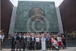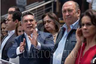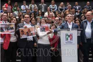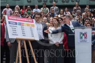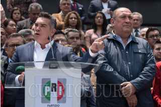 CIUDAD DE MÉXICO, 23MAYO2023.- Alejandro Moreno, diputado y dirigente nacional del PRI; Rubén Moreira, coordinador del PRI en la Cámara de Diputados; Carolina Viggiano, encabezaron conferencia de prensa frente al frontispicio del palacio legislativo de San Lázaro para manifestarse en contra de la campaña “ni un voto al PRI” organizada por Movimiento Ciudadano. FOTO: MARIO JASSO/CUARTOSCURO.COM