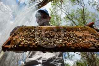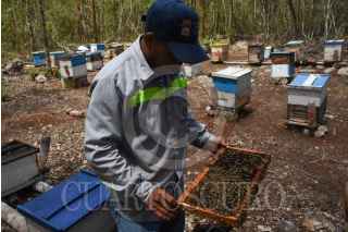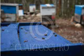 HOPELCHÉN, CAMPECHE, 23MAYO2023.-Apicultores de la cabecera del municipio de Hopelchén reportaron una segunda muerte masiva de abejas en varios ejidos del municipio. Hasta el momento se han contabilizado alrededor de más de 100 colmenas de 6 apiarios en la cabecera del poblado. Y es que apenas hace dos meses se reportó en el inicio de la temporada la muerte masiva y la pérdida total de los apiarios de los poblados de Suctuc y Crucero de Oxá, donde el resultado de los análisis toxicológicos realizados por el colegio de frontera sur ECOSUR, arrojó que la causa de la muerte de abejas fue por el usó de Fipronil, lo que dejó pérdidas de más de 12 millones solo en destrucción. El apicultor Santiago Caamal Chi es uno de los afectados, el perdió alrededor de 35 colmenas, lo que significa una pérdida de alrededor de 60 mil pesos, y aún siguen muriendo más abejas en sus apiarios, lamento la perdida de todo un año de trabajo y aunque desconoce el motivo de la muerte espera que se investigue su caso. FOTO: MICHAEL BALAM/CUARTOSCURO.COM