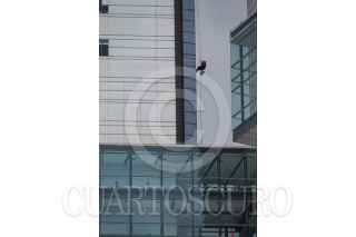 CIUDAD DE MÉXICO, 24MAYO2023.- En la zona de Santa Fe, una de las más altas en plusvalía de la capital, se observa a un limpiavidrios descender por las alturas para realizar su trabajo. FOTO: GALO CAÑAS/CUARTOSCURO.COM