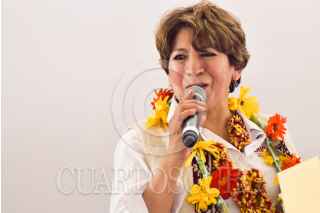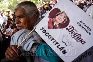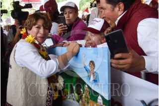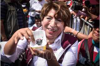 JOCOTITLÁN, ESTADO DE MÉXICO, 24MAYO2023.- Delfina Gómez, candidata a la gubernatura del Estado de México, por la coalición “Juntos Hacemos Historia” conformada por los partidos políticos: Morena, PT y PVEM, durante su gira de campaña en la plaza principal de la entidad. FOTO: MARIO JASSO/CUARTOSCURO.COM
