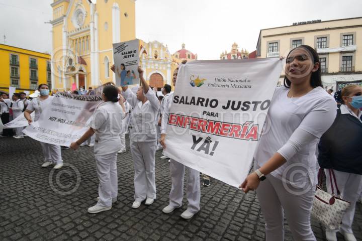 XALAPA, VERACRUZ, 25MAYO2023.- Trabajadores de Enfermería marcharon por las calles de Xalapa como protestar por llevar más de una década con contratación eventual, sin prestaciones “ni certeza laboral”. Se dicen inconformes porque la reestructuración de IMSS-Bienestar pretende bajar salarios hasta el 50 por ciento. FOTO: YERANIA ROLÓN/CUARTOSCURO.COM