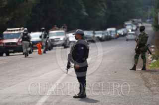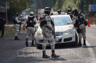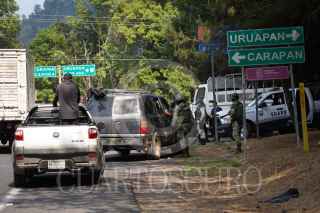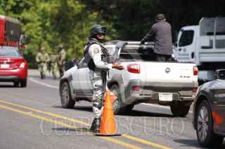 URUAPAN, MICHOACÁN, 26MAYO2023.- Elementos de la Guardia Nacional establecen un reten de revisión en la entrada de Uruapan donde la percepción de inseguridad es del 86.5 por ciento, ello representa un aumento, ya que el segundo trimestre de 2022 era de 84 por ciento, de acuerdo a cifras oficiales de la Encuesta Nacional de Seguridad Pública Urbana (ENSU). FOTO: JUAN JOSÉ ESTRADA SERAFÍN /CUARTOSCURO.COM