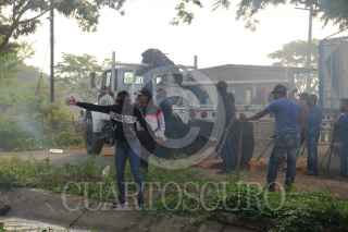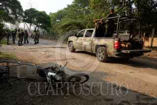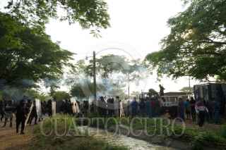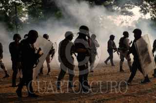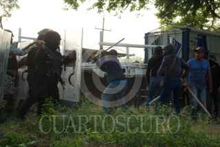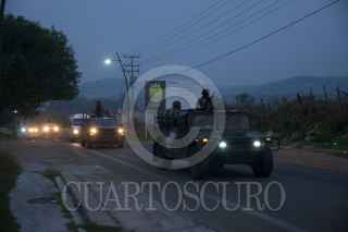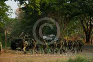 FRONTERA COMALAPA, CHIAPAS, 30MAYO2023.- Arrancó el Despliegue de Fuerza de Tareas dirigido por la SEDENA acompañado por la Guardia Nacional, Policía Estatal y Municipal rumbo a la región que ha sido azotada por la violencia entre grupos armados en incremento desde el año 2021 en comunidades fronterizas a Guatemala. El día 22 de Mayo del presente año estos grupos se han enfrentado sin descanso y con armamentos cada vez más altos, lo cual obligó a la población a desplazarse para salvaguardar sus vidas. Al entrar al municipio el convoy dirigido por el ejército nacional estos se encaminaron al ejido Joaquín Miguel Gutierrez, donde se encontraron con pobladores de la región y estos les impidieron el paso argumentando que el problema y la violencia está en la cabecera municipal y otros poblados. Después de un tiempo de diálogo sin acuerdos, el ejército empezó a avanzar a lo cual los pobladores respondieron con palos y piedras negando la entrada, elementos del ejército lanzaban bombas de gas lacrimógeno y las piedras de regresó para seguir con su incursión a la comunidad. FOTO: ISABEL MATEOS /CUARTOSCURO.COM