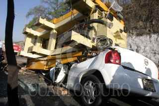 TLALNEPANTLA,EDOMEX20ABRIL2007.-Un camion cargado con maquinaria pesada volco sobre un auto chevy al vencerle el peso sobre la carretera Mexico-Queretaro a la altura de la quebrada, el conductor del compacto resulto lesionado. FOTO PEDRO MARRUFO/CUARTOSCURO.COM