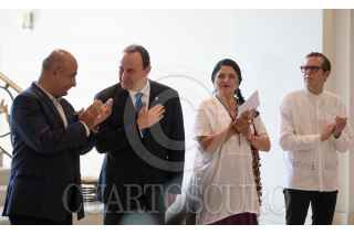 CIUDAD DE MÉXICO, 02JUNIO2023.- Alejandra Frausto Guerrero, secretaria de Cultura; Marco Tulio Chicas, embajador de Guatemala en México; Maximiliano Reyes Zúñiga, Subsecretario para América Latina y el Caribe, y Homero Fernández, director del Complejo Cultural Los Pinos, encabezaron en la Casa Miguel Alemán, la inauguración de la exposición y venta "Guatemala en Los Pinos". FOTO: MARIO JASSO/CUARTOSCURO.COM
