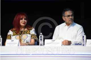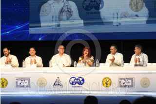 CAMPECHE, CAMPECHE, 07JUNIO2023.- La Gobernadora de Campeche Layda Sansores San Román y Octavio Romero Oropeza Director General de Petróleos Mexicanos, inauguraron la XVII edición del Congreso Mexicano del Petróleo, que se estará llevando los días 7 al 10 de Junio en Campeche. El Congreso tienen como finalidad promover el conocimiento y la actualización técnica y tecnológica que le permitan a México aprovechar, de manera óptima, la exploración y explotación de los hidrocarburos de la nación. FOTO: MICHAEL BALAM/CUARTOSCURO.COM