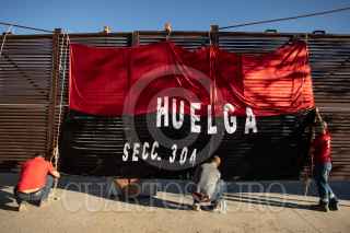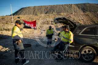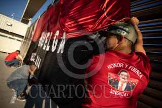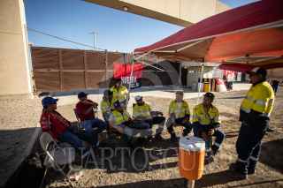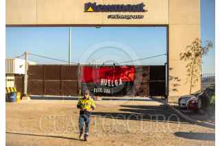 MAZAPIL, ZACATECAS, 08JUNIO2023.- Mineros sindicalizados cumplen 24 horas de huelga en la minera Peñasquito, de la empresa Newmont. Aproximadamente dos mil trabajadores sindicalizados adscritos a la sección 304 del Sindicato Nacional de Trabajadores Mineros Metalúrgicos y Similares de la República Mexicana, liderado por el senador Napoleón Gómez Urrutia; mantienen guardias permanentes en todas las puertas, durante tres turnos. Los líderes sindicales informaron que la empresa estadounidense, quien se encuentra en el primer lugar de producción de oro en America Latina; a violado reiteradamente durante varios años el Contrato Colectivo de Trabajo. Entre las violaciones principales se encuentran: resolución de varios problemas de seguridad en las instalaciones, trasparencia en la entrega de utilidades y el rechazo de la empresa a cubrir plazas vacantes. Hasta el momento la minera no ha realizado una propuesta para levantar la huelga de los trabajadores, por lo que las instalaciones se encuentran totalmente paradas, solo se mantiene trabajando la parte administrativa y de seguridad, quienes son trabajadores por contrato. FOTO: ADOLFO VALTIERRA /CUARTOSCURO.COM