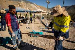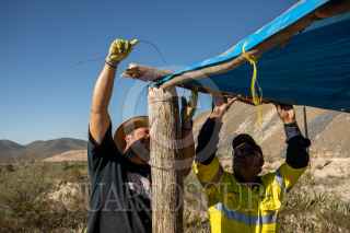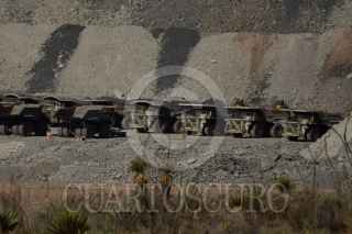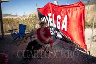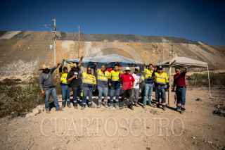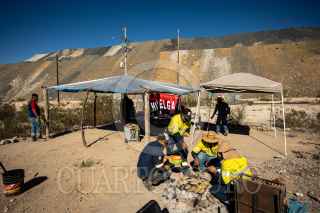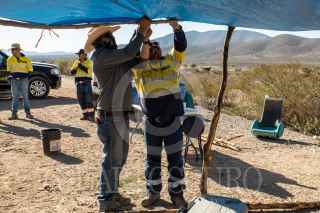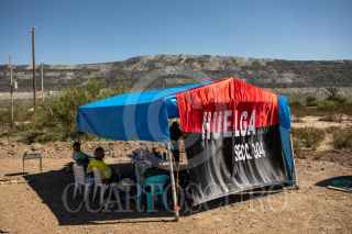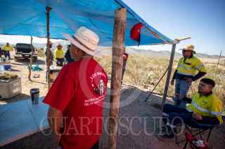 MAZAPIL, ZACATECAS, 09JUNIO2023.- Mineros sindicalizados, desayunan e instalan sombras para protegerse del sol, durante su guardia en la huelga laboral, que cumple 48 horas, en las instalaciones de la empresa Newmont, Peñasquito. Aproximadamente dos mil trabajadores sindicalizados adscritos a la sección 304 del Sindicato Nacional de Trabajadores Mineros Metalúrgicos y Similares de la República Mexicana, liderado por el senador Napoleón Gómez Urrutia; mantienen guardias permanentes en por lo menos 12 puertas, durante tres turnos. Los líderes sindicales informaron que la empresa estadounidense, quien se encuentra en el primer lugar de producción de oro en America Latina; a violado reiteradamente durante varios años el Contrato Colectivo de Trabajo. Entre las violaciones principales se encuentran: resolución de varios problemas de seguridad en las instalaciones, trasparencia en la entrega de utilidades y el rechazo de la empresa a cubrir plazas vacantes. Hasta el momento la minera no ha realizado una propuesta para levantar la huelga de los trabajadores, por lo que las instalaciones se encuentran totalmente paradas, solo se mantiene trabajando la parte administrativa y de seguridad, quienes son trabajadores por contrato. En la instalaciones de la mina se puede apreciar una soledad y silencio después de que tanto los molinos, como los cientos de camiones gigantes de trasporte de material, se encuentran apagados y estacionados en el interior. FOTO: ADOLFO VLADIMIR /CUARTOSCURO.COM