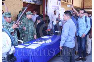 CUERNAVACA, MORELOS, 12JUNIO2023.- José Luis Urióstegui, alcalde de la ciudad, acompañado de Alicia Vázquez Luna, secretaria de Seguridad Publica de Cuernavaca, la campaña de canje de armas. La campaña es llevada a cabo por personal militar de la 24 Zona Militar y policías del municipio. La campaña inicia hoy y culmina el 15 de junio. Invitan a que quienes poseen algún arma de fuego en su domicilio se acerquen pues pueden canjearla y obtener una cantidad de dinero que varía según el calibre y calidad del arma. FOTO: MARGARITO PÉREZ RETANA / CUARTOSCURO.COM