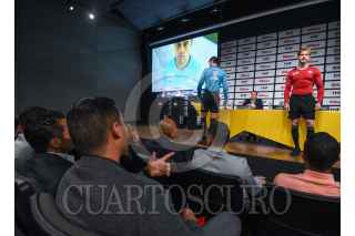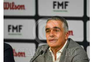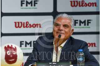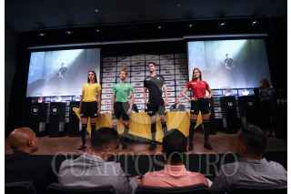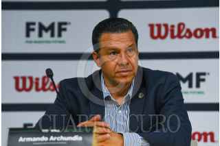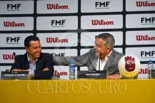 TOLUCA, ESTADO DE MÉXICO, 14JUNIO2023.- Armando Archundia, presidente de la Comisión de Árbitros; José Romano, Director General de ventas de la FMF y Juan Carlos Aziz, director general de Wilson Sporting Goods Co durante la presentación de los nuevos uniformes que utilizarán los árbitros, dando la bienvenida a la marca Wilson quienes respaldarán por 3 años las actividades de la Comisión de Árbitros. FOTO: CRISANTA ESPINOSA AGUILAR /CUARTOSCURO.COM