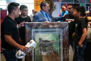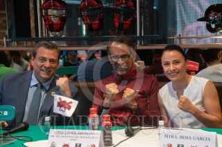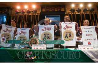CIUDAD DE MÉXICO, 13JUNIO2023.- Mauricio Sulaimán, presidente de Consejo Mundial de Boxeo; Javier Hidalgo, director general del Instituto del Deporte de la capital; y los boxeadores: David "Rey" Picasso, Erika "Dinamita" Cruz e Irma García, encabezaron la presentación de la nueva playera que será utilizada para la Clase Masiva de Box 2023 del próximo 17 de junio el zócalo capitalino. FOTO: MARIO JASSO/CUARTOSCURO.COM