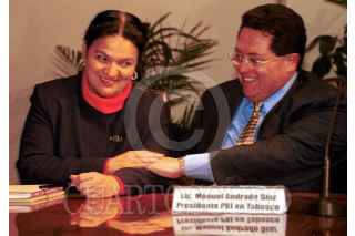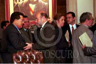 Manuel Andrade, lider del PRI en Tabasco, saluda al lider nacional del PAN Luis Felipe Bravo Mena después de las negociaciones en la SEGOB, donde se ratificó al priista Enrique Priego, como gobernador interino del Estado de Tabasco. FOTO: Christian Palma/CUARTOSCURO.COM