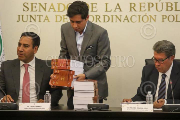 CIUDAD DE MÉXICO. 15JUNIO2023.- El Senador Chiapaneco Eduardo Ramírez recibe el informe de manos de Ricardo Monreal Ávila, quien deja su cargo para contender por la candidatura a la Presidencia por Morena. FOTO: VICTORIA VALTIERRA/CUARTOSCURO.COM