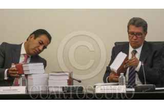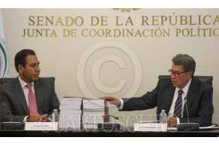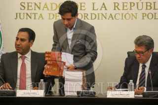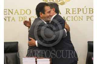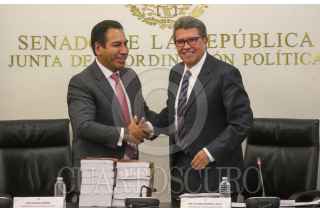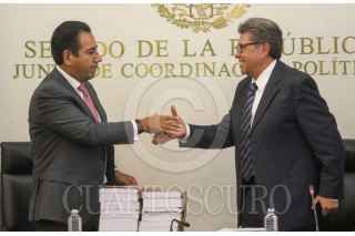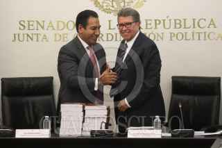 CIUDAD DE MÉXICO. 15JUNIO2023.- El Senador Chiapaneco Eduardo Ramírez recibe el informe de manos de Ricardo Monreal Ávila, quien deja su cargo para contender por la candidatura a la Presidencia por Morena. FOTO: VICTORIA VALTIERRA/CUARTOSCURO.COM