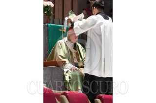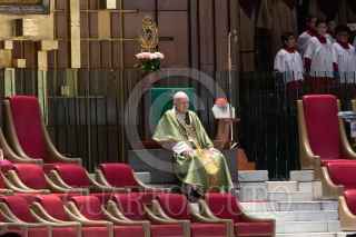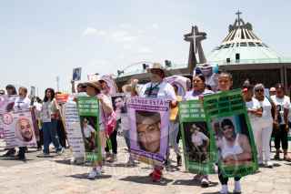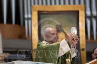 CIUDAD DE MÉXICO, 18JUNIO2023.- En la homilía de este medio día en la Basílica de Guadalupe se recordó a los sacerdotes jesuitas asesinados en Cerocahui, Chihuahua, hace un año. A la misa también asistieron personas que buscan algún familiar desaparecido. Durante la liturgia se observo un cuadro con la imagen de los sacerdotes Javier Campos y Joaquín Mora, misma que fue conducida por el Arzobispo Primado, Carlos Aguiar Retes. FOTO: MOISÉS PABLO/CUARTOSCURO.COM