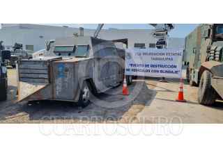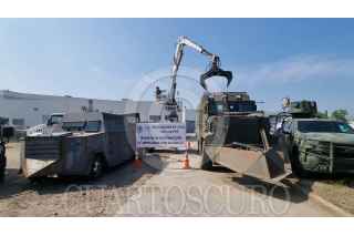 REYNOSA, TAMAULIPAS, 18JUNIO2023.- La Fiscalía General de la República (FGR), a través de la Fiscalía Especializada de Control Regional (FECOR), en su Delegación en Tamaulipas, dio cumplimiento al Programa Destino de Bienes y Objetos del Delito, el cual establece la destrucción de objetos que son instrumentos del delito. En el evento, llevado a cabo en las instalaciones de la FGR ubicadas en Reynosa, Tamaulipas, y relacionado con 12 expedientes, fueron destruidos 14 vehículos con blindaje artesanal, asegurados en diversos enfrentamientos en dicha entidad. FOTO: FGR/CUARTOSCURO.COM