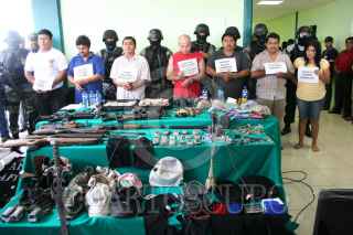 VILLAHERMOSA, TABASCO, 23ABRIL2007.- En las instalaciones de la Procuraduría General de Justicia se llevo a cabo la presentación de una peligrosa banda delictiva, ahí exhibieron un arsenal en armas largas y cortas, uniformes y camisas con la leyenda A.F.I. Presumen que estos malhechores tienen relación con “Zetas”. FOTOS: MARCO POLO GUZMÁN HERNÁNDEZ/CUARTOSCURO.COM