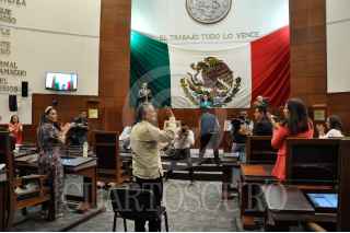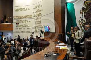 ZACATECAS, ZACATECAS, 21JUNIO2023.- La LXIV legislatura del Estado de Zacatecas en sesión solemne entregó el nombramiento como Ciudadano Ilustre del Estado de Zacatecas al fotoperiodista Pedro Valtierra Ruvalcaba , y con ello reconocer y celebrar las aportaciones que a lo largo de su carrera ha ofrecido a nuestro país y a nuestro estado. Posteriormente en compañía de las y los diputados, el homenajeado, inauguró la exposición "Sin miedo a la Luz" compuesta de varias fotografías tomadas del movimiento revolucionario en Nicaragua en 1979, que se exhibe en el vestíbulo del Congreso del Estado de Zacatecas. FOTO: CARLOS SEGURA/CUARTOSCURO.COM