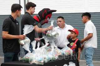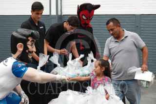 CIUDAD DE MÉXICO, 21JUNIO2023.- A un mes del arranque de la primera edición de la Leagues Cup, la Liga MX y MLS, de manera conjunta presentaron su campaña Unidos en Contra del Hambre, Mariana Jiménez, directora de la Red de Bancos de Alimentos de México, y los futbolistas Fernando Arce y Haret Ortega encabezaron la entrega de paquetes alimentarios a familias de Iztapalapa en la Central de Abastos. FOTO: GRACIELA LÓPEZ /CUARTOSCURO.COM