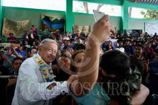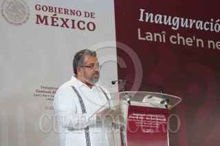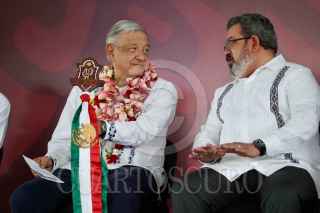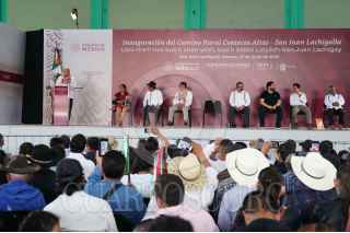 SAN JUAN LACHIGALLA, OAXACA, 25JUNIO2023.- Andrés Manuel López Obrador, Presidente de México, encabezó la inauguración del Camino Rural Coatecas Altas-San Juan Lachigalla. Lo acompañaron Salomón Jara Cruz, Gobernador de Oaxaca; Jorge Nuño Lara, Secretario de Infraestructura, Comunicaciones y Transportes; Adelfo Regino Montes, Director General del Instituto Nacional de los Pueblos Indígenas; Juan Pablo de Botton Falcón, subsecretario de egresos de la Secretaria de Hacienda y Crédito Público; Jorge Mendoza Sánchez, director general del Banco Nacional de Obras y Servicios Públicos (Banobras) y Eloisa Melchor Ruiz, presidenta municipal de San Juan Lachigalla, Oaxaca. FOTO: PRESIDENCIA/CUARTOSCURO.COM