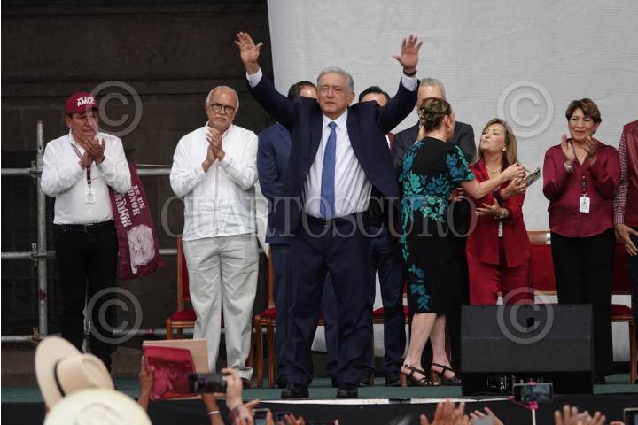 CIUDAD DE MÉXICO, 01JULIO2023.- Andrés Manuel López Obrador, presidente de México, acompañado de su esposa Beatriz Gutiérrez Müller y el gabinete de la 4T, encabezaron el Festejo por los 5 años del Triunfo Democrático para la Transformación de México realizado en el Zócalo capitalino. FOTO: GRACIELA LÓPEZ /CUARTOSCURO.COM