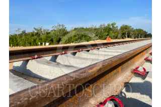 CANCÚN, QUINTANA ROO. 05JULIO2023.- Aspectos de los trabajos del Tren Maya en su tramo 5, en las inmediaciones del aeropuerto de Cancún, Quintana Roo. Vías y trabes del ferrocarril del sureste Mexicano, que casi está listo para su inauguración. FOTO: ELIZABETH RUÍZ/CUARTOSCURO.COM