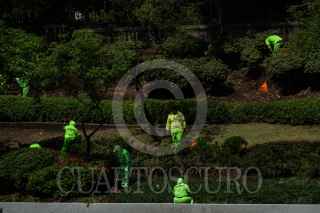 CIUDAD DE MÉXICO, 10JULIO2023.- Distinguidos por sus uniformes verde fosforescente, un grupo de trabajadores de la Ciudad de México limpian las áreas verdes aledañas a la Primer Sección del Bosque de Chapultepec en los límites de la alcaldía Cuauhtémoc y Miguel Hidalgo. FOTO: GALO CAÑAS/CUARTOSCURO.COM