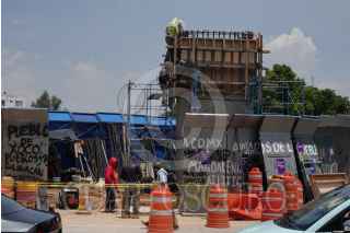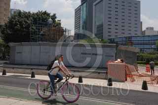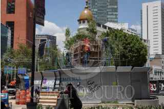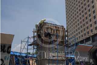 CIUDAD DE MÉXICO, 12JULIO2023.- Trabajadores de obra colocan varillas en el pedestal donde será colocada la escultura de La joven de Amajac, a un costado de la Glorieta de las Mujeres que Luchan en Avenida Reforma. FOTO: GRACIELA LÓPEZ /CUARTOSCURO.COM