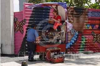 CIUDAD DE MÉXICO, 12JUKIO2023.- Un lustrador cepilla un zapato mientras una mujer observa su celular en Avenida Reforma. FOTO: GRACIELA LÓPEZ /CUARTOSCURO.COM