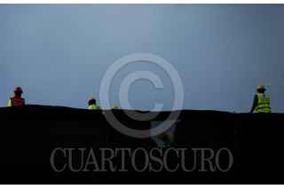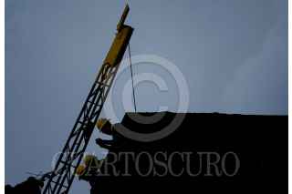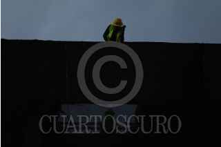 CIUDAD DE MÉXICO, 12JULIO2023.- Con una inmensa nube gris como fondo, trabajadores de la construcción que se encuentran demoliendo el edificio Plaza Condesa en la colonia Condesa, de la alcaldía Cuauhtémoc, destacan por sus uniformes flourescentes mientras laboran en el techo. FOTO: GALO CAÑAS/CUARTOSCURO.COM