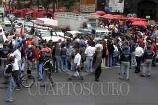 MÈXICO,D.F.27ABRIL2007.-Mas de 100 empleados de la empresa de telemarketing Citel S.A. (ventas por telefono) y que sus oficinas se ubican en la torre latinoamericana, fueron despedidos, segun ellos, sin aviso ni liquidacion, por lo que bloquearon por momentos la circulacion vial del Eje Central.en protesta. FOTO PEDRO MARRUFO/CUARTOSCURO.COM