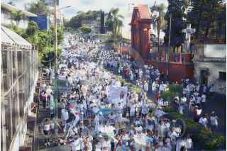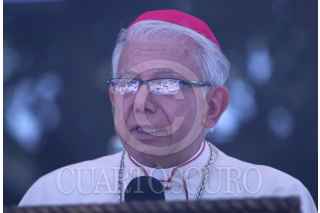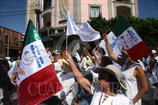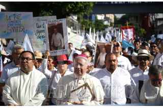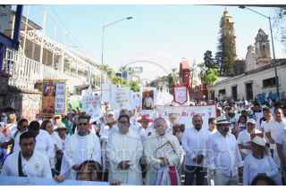 CUERNAVACA, MORELOS, 15JULIO2023.- Cientos de fieles católicos participaron en la novena edición de la Caminata por la Paz en Morelos, realizada esta mañana y que partió del Santuario de Nuestra Señora de los Milagros hasta la Catedral de la capital. Encabezada por el obispo Ramon Castro, el cual realizo varias paradas durante la caminata, platicando con víctimas de la violencia y realizando oración. El discurso del también secretario de la Conferencia del Episcopado Mexicano rechazo la estrategia federal de seguridad de "abrazos no balazos", a la vez que advirtió de la injerencia del crimen organizado en los procesos electorales que vienen y finalmente critico el asistencialismo del gobierno federal de dar dinero directamente. FOTO: MARGARITO PÉREZ RETANA / CUARTOSCURO.COM