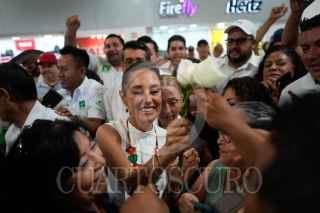 PUERTO VALLARTA, JALISCO, 15JULIO2023.- Claudia Sheinbaum Pardo, ex jefa de Gobierno de la Ciudad de México y aspirante a ser electa como representante de Morena en las elecciones de 2024, fue recibida en el aeropuerto de Puerto Vallarta para partir rumbo a Nayarit en donde sostuvo una asamblea informativa con simpatizantes. FOTO: ESPECIAL/CUARTOSCURO.COM