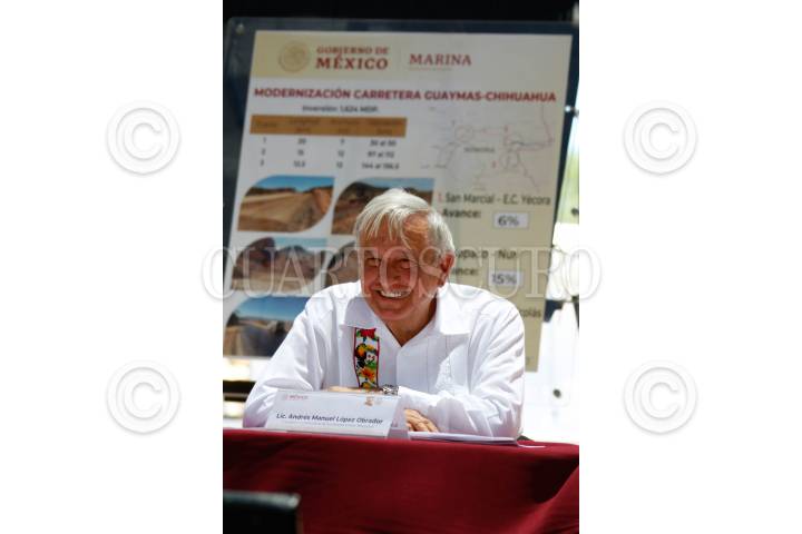YECORA, SONORA, 16JULIO2023.- Andrés Manuel López Obrador, Presidente de México; Alfonso Durazo, gobernador de Sonora; Jorge Nuño Lara, secretario de Infraestructura, Comunicaciones y Transportes (SICT), y Adelfo Regino Montes, director del Instituto Nacional de los Pueblos Indígenas (INPI), durante la supervisión de la modernización de la carretera Guaymas-Chihuahua. FOTO: PRESIDENCIA/CUARTOSCURO.COM