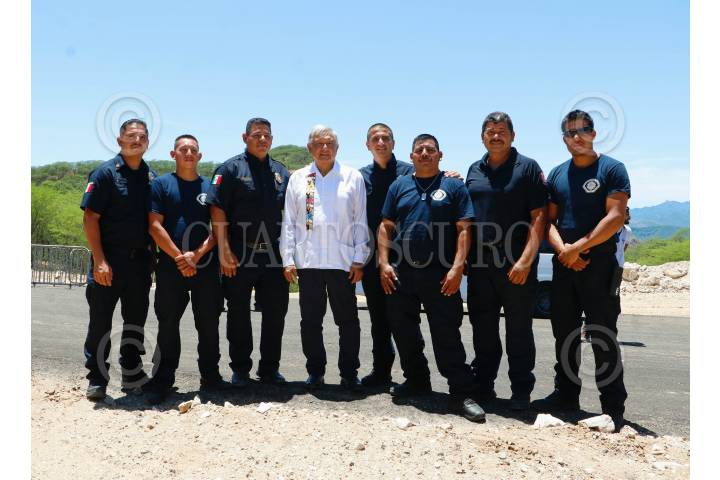 YECORA, SONORA, 16JULIO2023.- Andrés Manuel López Obrador, Presidente de México; Alfonso Durazo, gobernador de Sonora; Jorge Nuño Lara, secretario de Infraestructura, Comunicaciones y Transportes (SICT), y Adelfo Regino Montes, director del Instituto Nacional de los Pueblos Indígenas (INPI), durante la supervisión de la modernización de la carretera Guaymas-Chihuahua. FOTO: PRESIDENCIA/CUARTOSCURO.COM